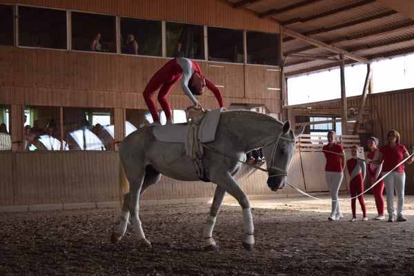 tun, da jede Gruppe auf einem anderen Pferd turnte. Um 14:50 Uhr wurde die Halle umgebaut und die zwei letzten Prüfungen des Tages, der Nachwuchsgruppen (Leistungsklassen F und G), wurden