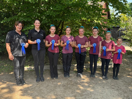 Für die zweite Voltigiermannschaft vom Reit- und Fahrverein Eicklingen ging es am 14. Juni zum Voltigierturnier nach Burgdorf zum Reit- und Voltigierverein An der Aue. Am Samstag, dem 14. Juni startete Eicklingen II vormittags um 10:40 Uhr in der Prüfung der E-Gruppen (Pflicht im Galopp - Kür im Schritt). Die Gruppe um die Trainerinnen Christiane Adam, Lena Sieberer und Frederike Heidmann zeigte auf Vereinspferd Calan (Calle) die vorgeschriebenen sechs Übungen (freier Grundsitz, Seitsitz, Bank, freies Knien, Abgang nach innen und Landung) im Galopp. Für Anni Gebhardt, Leni Schäfer, Ailyna Marzinek, Isabel Rink, Pauline Heinrich und Emily Zimmermann folgte nach der Pflicht direkt die Kür im Schritt. Die Siegerehrung fand mittags bei 31 Grad in der Reithalle statt. Die Mädchen von Eicklingen II, die zwischen 10 und 15 Jahren sind, erreichten mit einer Wertnote von 5,840 Punkten den vierten Platz von sechs Mannschaften in der ersten Abteilung. Insgesamt traten 13 Mannschaften in diesem Wettbewerb an. Burgdorf war für Eicklingen II das zweite Turnier des Jahres. Nach den Sommerferien am 06. September steht dann schon unser heimischen Turnier in Eicklingen an.