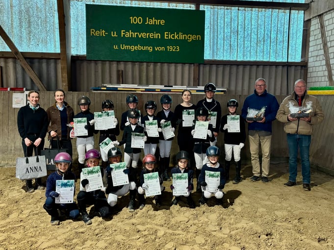 In der zweiten Herbstferienwoche hat im Reit- und Fahrverein Eicklingen ein Abzeichen-Lehrgang stattgefunden. Organisiert und durchgeführt wurde die Kurswoche von Anna und Lara Prieß. Die beiden Trainierinnen haben die jungen Reiter:innen intensiv in verschiedenen Einheiten auf den Prüfungstag vorbereitet. So galt es je nach Schwierigkeitsgrad die Hufschlagfiguren korrekt zu reiten, eine Bodenstange oder ein Cavaletti zu überqueren oder ein Pferd in der Dreiecksbahn vorzuführen. Für die schwierigeren Abzeichen war eine Dressuraufgabe zu reiten und ein Springparcours zu absolvieren. Auch theoretisches Wissen mussten sich die teils noch sehr jungen Teilnehmenden aneignen: Körperteile eines Pferdes, Bezeichnungen für die einzelnen Teile des Zaumzeuges und des Sattels sowie gesunde Haltung der Vierbeiner wurden in der Prüfung abgefragt.